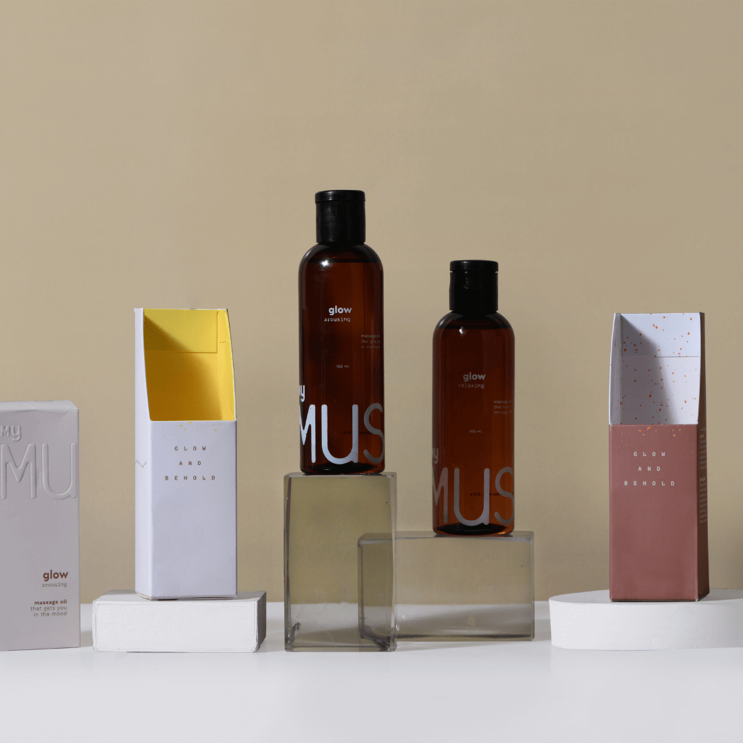 MyMuse’s Glow Relaxing massage oil Bottle (100ml) with demonstration of its packaging box