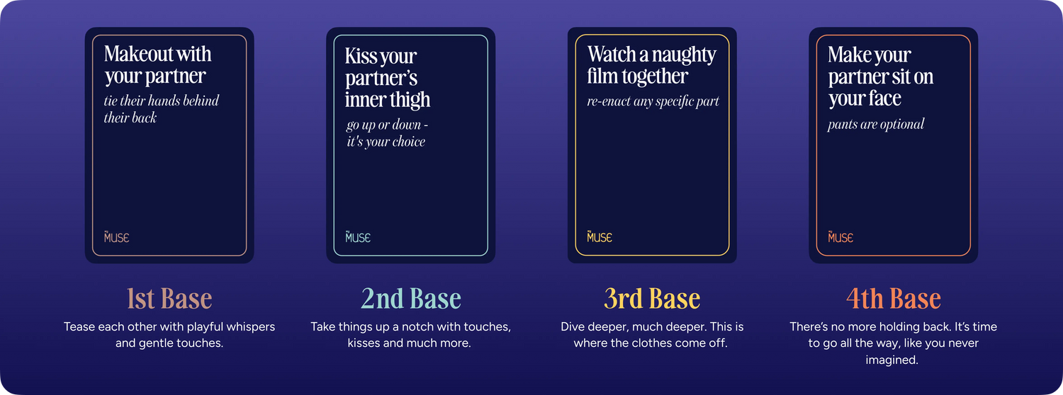 So, we created Naughty Cards! This isn’t your usual naughty card game for couples; it's your ticket to a hotter, more sensual adventure with your partner. We created 50 action-based cards across four intensity levels, that go from ‘a little cheeky’ to 'OMG', along with 10 condition cards for that extra bit of unpredictability.